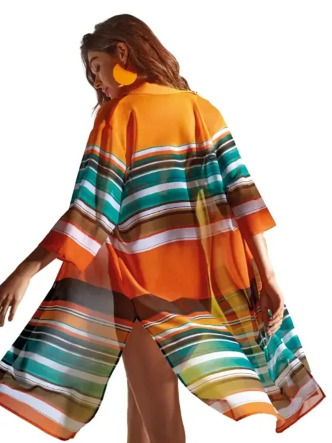 Ta wielokolorowa koszula wyróżnia się unikalnym designem i starannym wykończeniem. Wykonana z wysokiej jakości materiałów, zapewnia komfort noszenia podczas ciepłych, letnich dni. Dzięki zastosowaniu wielobarwnych wzorów, koszula sprawia, że każdy dzień na plaży staje się bardziej stylowy i pełen koloru. Dekolt zakończony klasycznym kołnierzykiem dodaje całości elegancji, a jej jednocześnie długi krój oraz rękawy 3/4 zapewniają odpowiednią ochronę przed słońcem, nie rezygnując z luźnego, plażowego stylu.