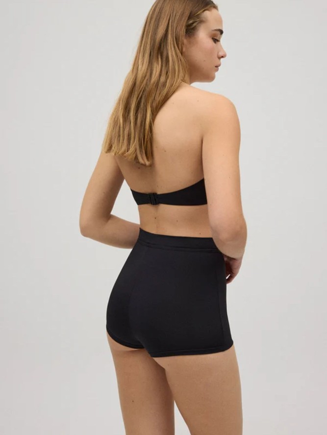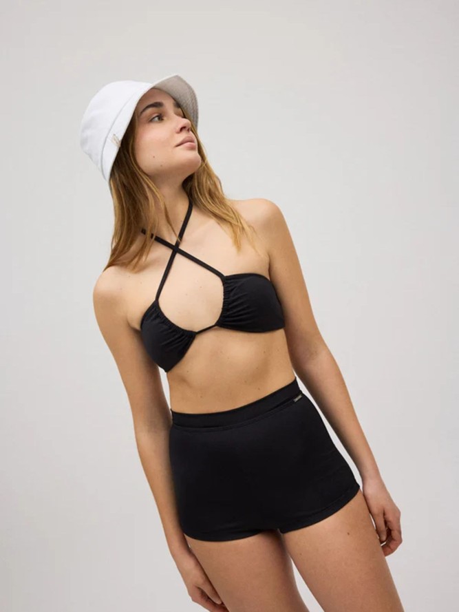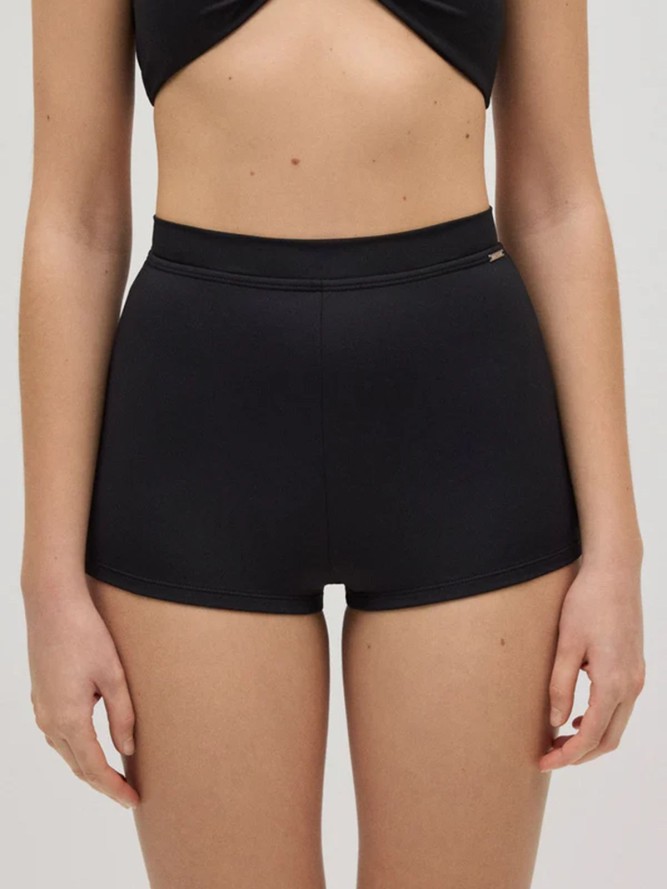 Model charakteryzuje się klasycznym fasonem o średniej długości nogawki, który doskonale podkreśla sylwetkę, jednocześnie zapewniając swobodę ruchów. Czarne wykończenie dodaje wyjątkowego szyku, dzięki czemu łatwo połączysz je z dowolnym kolorowym topem lub dodatkami, tworząc idealną stylizację na plażowy wypad.