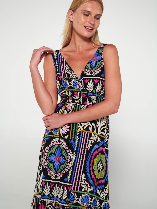 Sukienka VAMP 20401 przyciąga uwagę swoim wielokolorowym wzorem, nadając każdemu lookowi świeżości i wyrazu. Dzięki długiemu krojowi i dekoltowi w kształcie litery V, świetnie podkreśla sylwetkę, dodając elegancji i kobiecości. Model jest odcięty pod biustem, co dodatkowo podkreśla talię, zapewniając wygodę i doskonałe dopasowanie.