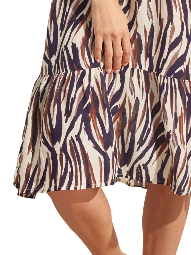 Sukienka posiada dekolt w literę V, który optycznie wydłuża szyję i dodaje kobiecości. Fason został zaprojektowany z myślą o swobodnym ruchu, co sprawia, że jest niezwykle wygodna w noszeniu. Sukienka ma odpowiednią długość, by zapewnić komfort podczas wakacyjnych aktywności, a jej wielokolorowy wzór przyciągnie spojrzenia i podkreśli letnią opaleniznę.