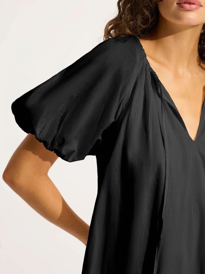 Poznaj urok i elegancję, jakie oferuje dodatek plażowy Seafolly BeachEdit 55415-DR. Ta zachwycająca czarna sukienka to idealny wybór dla każdej kobiety, która pragnie łączyć styl i komfort na plaży. Stylowy dekolt w literę V dodaje elegancji i doskonale podkreśla kobiecą sylwetkę, jednocześnie zapewniając lekkość i przewiewność. Fason sukienki jest zaprojektowany z myślą o wygodzie, doskonale układa się na ciele, a delikatnie zwężany krój daje poczucie swobody i świeżości podczas upalnych dni.