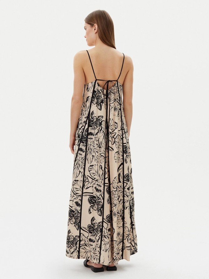 Dzięki dekoltowi w literę V sukienka podkreśla kobiece kształty i dodaje lekkości. Fason jest zwiewny, co sprawia, że materiał delikatnie opływa sylwetkę, zapewniając uczucie swobody. Długość sukienki jest optymalna, co czyni ją doskonałą zarówno na spacery po plaży, jak i romantyczne kolacje przy zachodzie słońca.