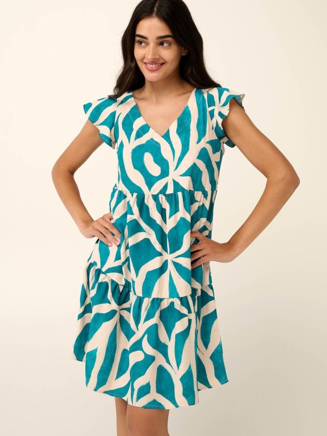Ta wielokolorowa sukienka wyróżnia się uroczym i subtelnie kobiecym krojem. Krótka długość dodaje jej lekkości i sprawia, że jest doskonała na gorące dni. Dzięki wyrafinowanemu dekoltowi w literę V, sukienka świetnie podkreśla linię szyi i dodaje elegancji. Krótki rękaw jest idealnym rozwiązaniem, które zapewni Ci komfort nawet w najcieplejsze dni, jednocześnie chroniąc przed nadmierną ekspozycją na słońce.