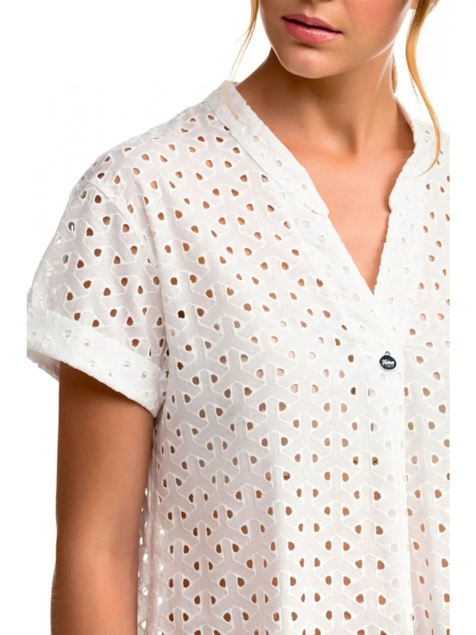 Tunika wykonana jest z lekkiego, przewiewnego materiału, który doskonale sprawdzi się w ciepłe, letnie dni. Krótka długość i dekolt w kształcie litery V dodają tunice kobiecego charakteru, jednocześnie zapewniając wygodę noszenia. Kolor kremowy sprawia, że tunika jest uniwersalna i łatwo ją zestawić z różnymi elementami garderoby.