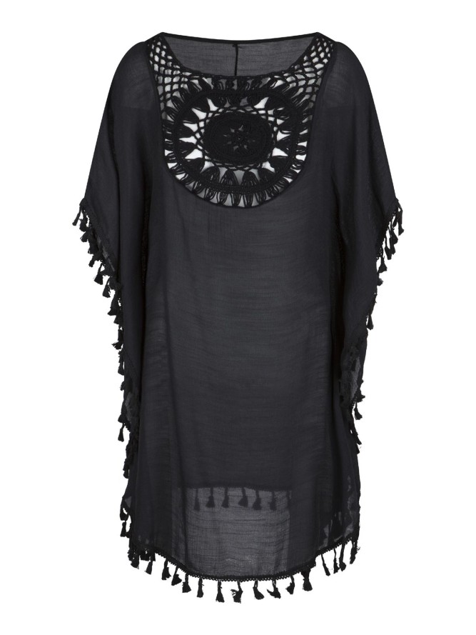 Ta czarna tunika została zaprojektowana z myślą o stylowych plażowiczkach. Posiada okrągły dekolt, co zapewnia swobodę oraz podkreśla szyję. Dzięki krótkiemu krojowi podkreśla sylwetkę, jednocześnie pozostawiając dużą swobodę ruchu.