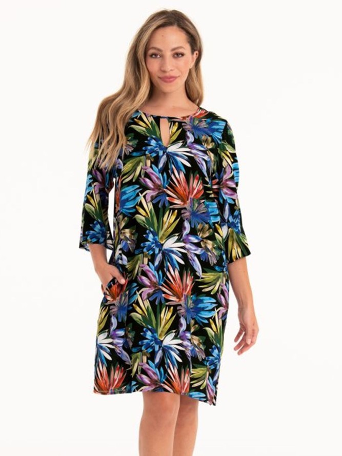 Główne cechy tuniki to okrągły dekolt, który subtelnie podkreśla linię szyi, oraz rękaw o długości 3/4, który dodaje elegancji i chroni przed słońcem. Tunika Anita Salla nie jest rozpinana, co zapewnia płynność i spójność stylizacji.