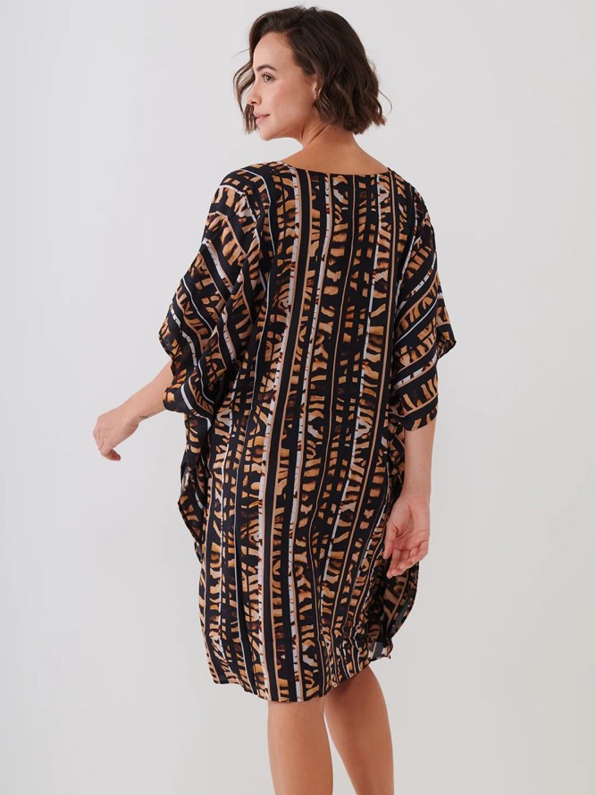Tunika wykonana jest z lekkiego i przewiewnego materiału, co czyni ją idealnym dodatkiem na ciepłe dni. Jej głównym atutem jest efektowny czarno-brązowy wzór, który dodaje elegancji każdej stylizacji. Dzięki dobrze dobranej kolorystyce łatwo połączyć ją z innymi elementami garderoby, co pozwala na tworzenie nieskończonych kombinacji modowych. Dekolt w literę V dodaje kobiecości i wysmukla sylwetkę, podkreślając jej naturalne atuty.