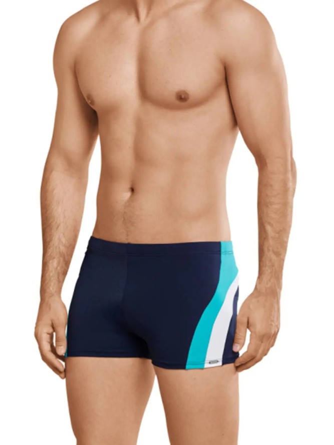 Klasyczne kąpielówki męskie o kroju bokserek. Na bokach wstawki w kontrastującym kolorze po jednej stronie z logo firmowym a po przeciwnej z napisem firmowym. W pasie wykończone elastyczną gumką oraz sznurkiem pozwalającym regulować obwód....
