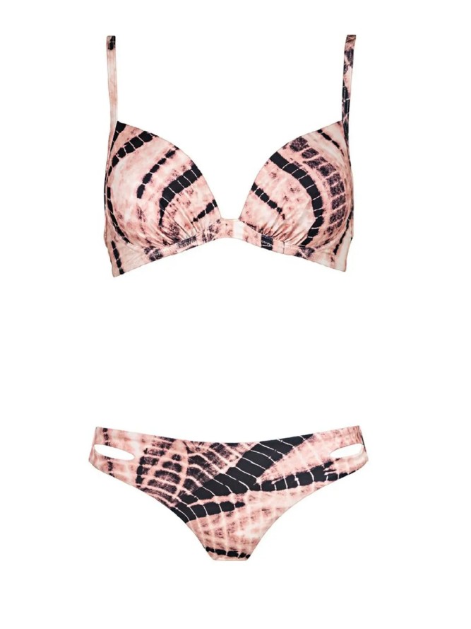 Stylowy, a zarazem bardzo kobiecy biustonosz kąpielowy z kolekcji Batik Beach. Model wykonany z wysokiej jakości tkaniny o biało pudrowej barwie ozdobionej charakterystycznym wzorem zwierzęcym. Posiada gładkie, bezszwowe miseczki, które dzięki usztywnieniu i fiszbinie doskonale unoszą i zbierają biust do środka. To niezwykle klasyczny element mody plażowej, który łączy w sobie wygodę z nienaganną prezencją. Maksimum komfortu zapewniają mu proste, regulowane ramiączka z możliwością odpięcia ze skrzyżowaniem na plecach i wygodne zapięcie. Model ten jest wyjątkowy także pod względem wysokogatunkowej tkaniny, szybkoschnącej i odpornej na działanie promieni UV.