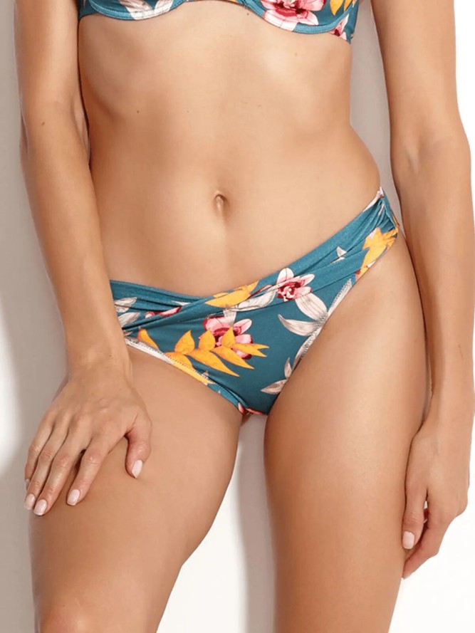 To stylowe, a zarazem bardzo kobiece figi kąpielowe z kolekcji Hyper Vintage nawiązujące do modnych już od wielu sezonów trendów florystycznych. Wykonane w całości z tkaniny w kolorze butelkowej zieleni ozdobionej wielobarwnym motywem egzotycznych kwiatów. Łączą wygodę z nienaganną prezencją. Model posiada klasyczny krój i umiarkowane wykrojenie. Szyku i elegancji dodaje mu fantazyjny pas poprzeplatany tkaniną na kształt litery V, która subtelnie podkreśla kobiecą sylwetkę i zmysłowo eksponuje biodra. Tył łagodnie okala pośladki. Model ten jest wyjątkowy także pod względem wysokogatunkowej tkaniny, szybkoschnącej i odpornej na działanie promieni UV. Dedykowany miłośniczkom ponadczasowych wzorów kwiatowych w nietuzinkowym wydaniu.