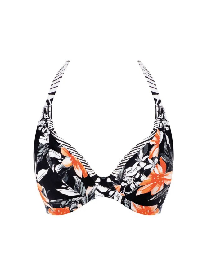 Góra od bikini, miękka miseczka, na fiszbinie, dobrze obejmująca biust, ramiączka wypinane z tyłu, dzięki czemu można je krzyżować na plecach. Model dobrze sprawdza się przy dużych biustach. Piękne, żywe kolory w motywach liściastych czyni całość...