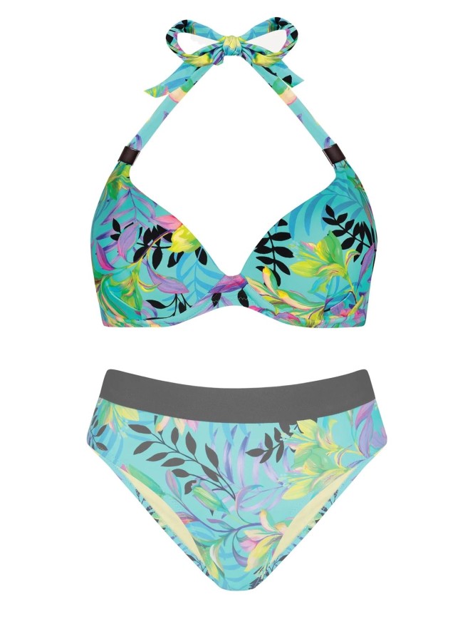 Kostium kąpielowy Feba FG11 to doskonały wybór dla kobiet poszukujących zarówno elegancji, jak i funkcjonalności w modzie plażowej. Góra od bikini została zaprojektowana z miseczkami typu push-up, co zapewnia doskonałe podtrzymanie oraz podkreślenie naturalnego kształtu biustu, nadając mu pełniejszego wyglądu. Model ten charakteryzuje się motywem kwiatowym, który wprowadza świeżość i subtelny urok, idealnie wpisując się w letnie trendy.