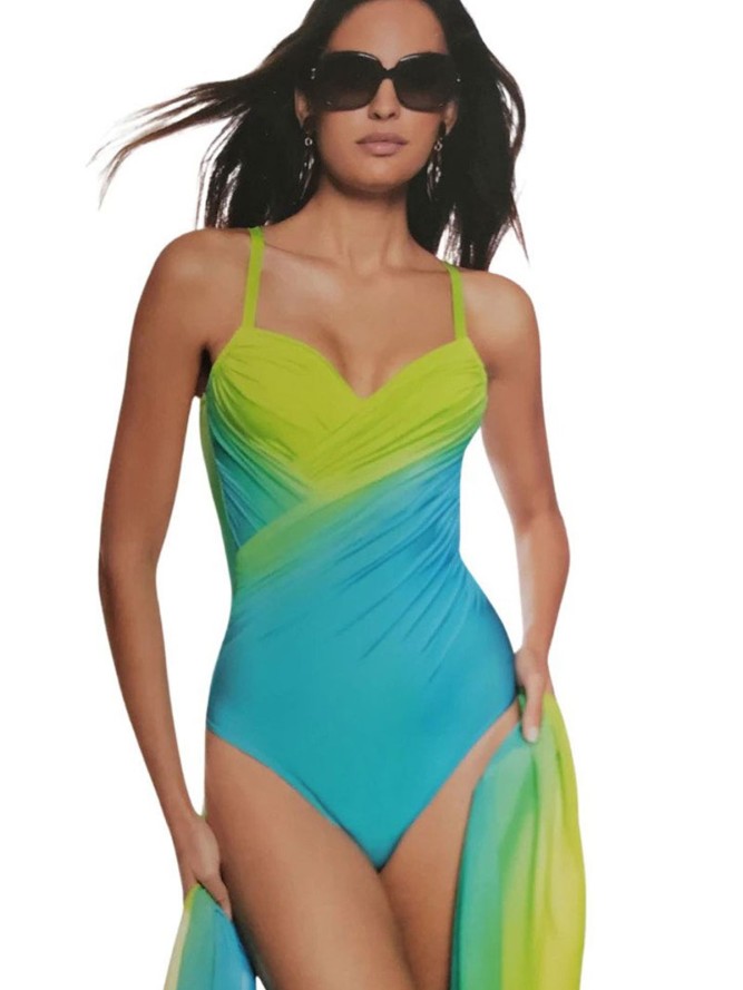 Jednoczęściowy kostium kąpielowy, z regulowanymi ramiączkami, bez fiszbin, miseczki z wypełnieniem i elastycznym pasem pod biustem. Boczne marszczenie efektownie ukrywa niedoskonałości, a metaliczna aplikacja pięknie mieni się przy biuście....