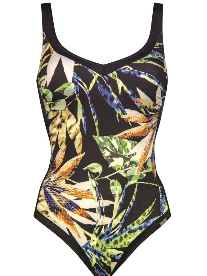 KOSTIUM KĄPIELOWY CHARMLINE MIDNIGHT SOUNDS 1437 - elegancja i komfort na plaży. Ten jednoczęściowy kostium kąpielowy zachwyca oryginalnym designem i wysoką jakością wykonania, idealny dla miłośniczek stylowych rozwiązań. Góra stroju z miseczkami typu soft, bez fiszbin, gwarantuje wygodę i naturalne podtrzymanie. Dzięki zastosowanemu materiałowi o właściwościach modelujących, kostium delikatnie podkreśla sylwetkę, zapewniając komfort w każdej sytuacji. Dół kostiumu, prosty i klasyczny, świetnie komponuje się z motywem liściastym, który nadaje strojowi nowoczesny, a zarazem subtelny wygląd. Niezależnie od tego, czy planujesz relaks na plaży czy aktywny wypoczynek w wodzie, kostium kąpielowy CHARMLINE MIDNIGHT SOUNDS 1437 to doskonały wybór dla każdej kobiety. Wykonany z materiału o dużej odporności na działanie słońca i chloru, zapewnia długotrwałe użytkowanie. Wybierz elegancję i funkcjonalność na najwyższym poziomie.