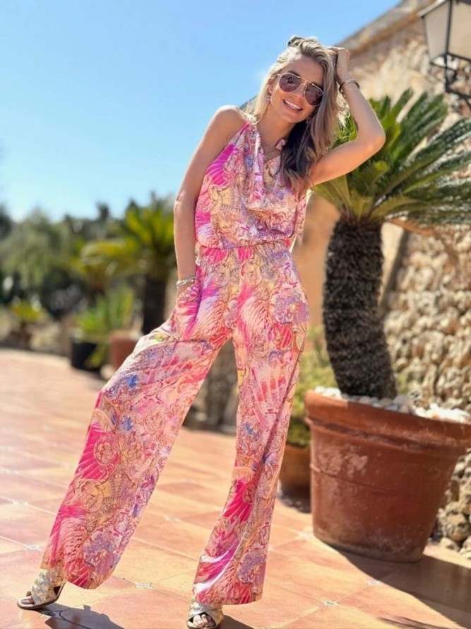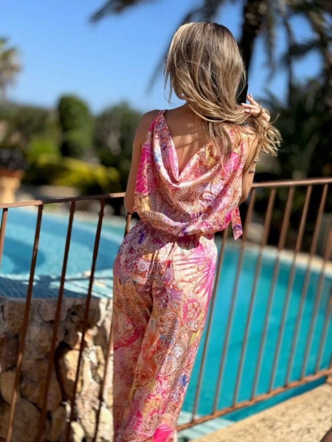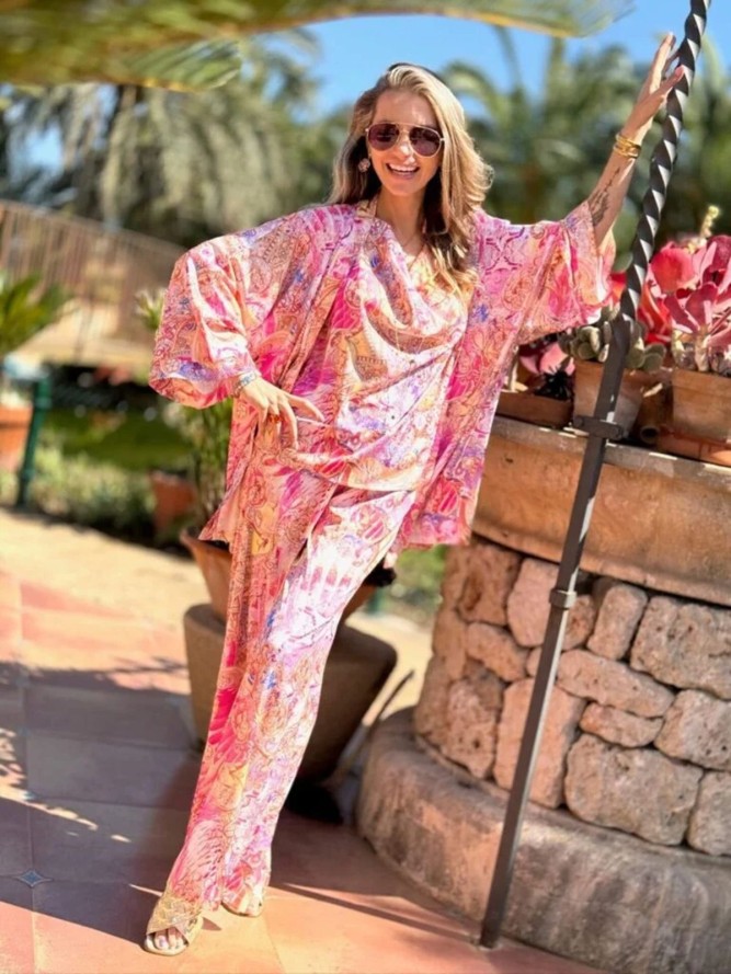 Fason kompletu podkreśla kobiecą sylwetkę, a jego wielokolorowy design przyciąga wzrok i sprawia, że idealnie pasuje do letnich strojów kąpielowych. Spodenki o uniwersalnej długości oferują komfort i swobodę ruchów, a jednocześnie dodają szykownego wyglądu każdej stylizacji. Kategoria damskie zapewnia, że komplet został stworzony z myślą o współczesnych kobietach ceniących sobie styl i wygodę.